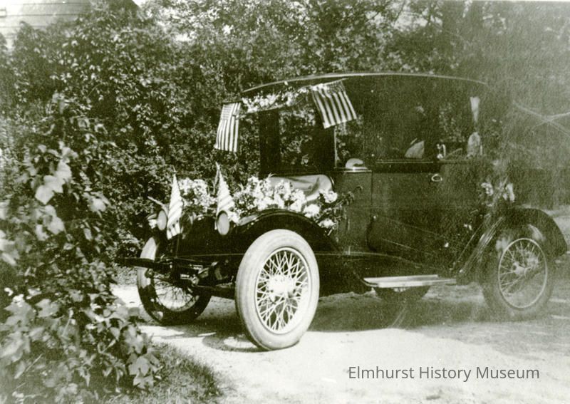 Car decorated with flowers and American flags.Photograph Details