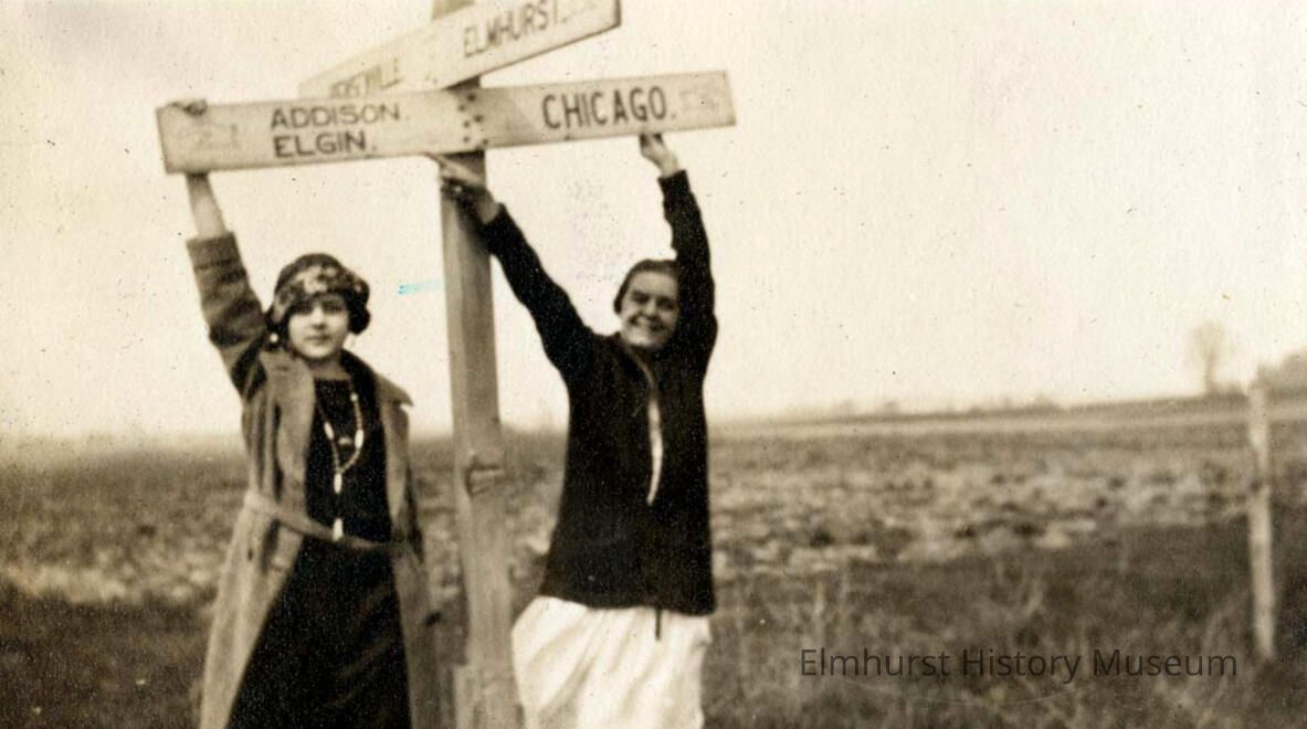 Two girls pose for a photo at a directional sign presumably located at York Road and Lake Street, between Elmhurst and Bensenville, Addison and Chicago.Photograph Details