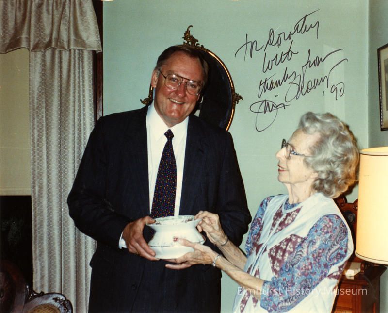 On front: To Dorothy with thanks from Jim Thompson '90 On back: Dorothy Graue with IL Governor James R. Thompson, 1990