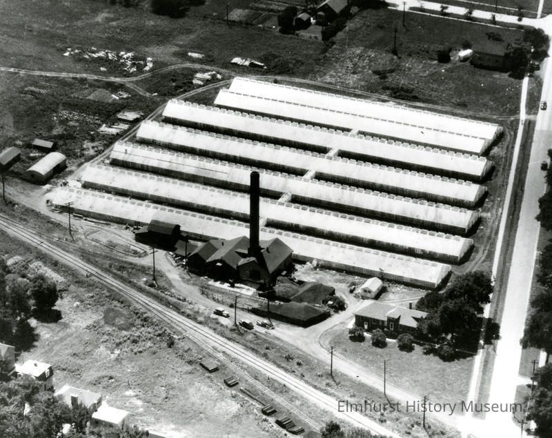 Aerial view of Dramm greenhouses at 601 S. York Street. The family-owned business was in operation 1914 - 1966.Photograph Details
