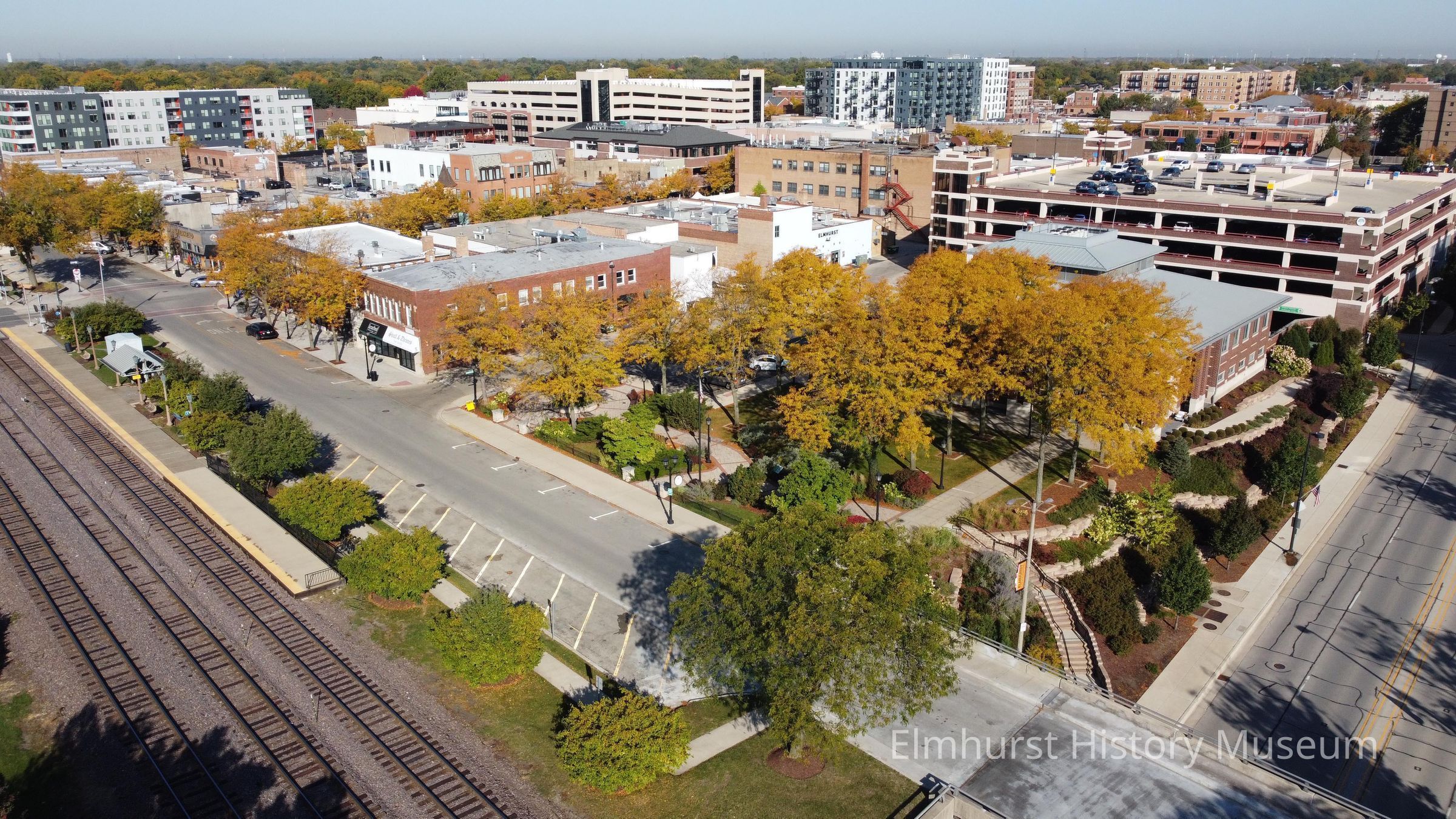 Aerial view of the Elmhurst Police Department and shopfronts on E. First Street, looking northwest from above the Palmer underpass.Photograph Details