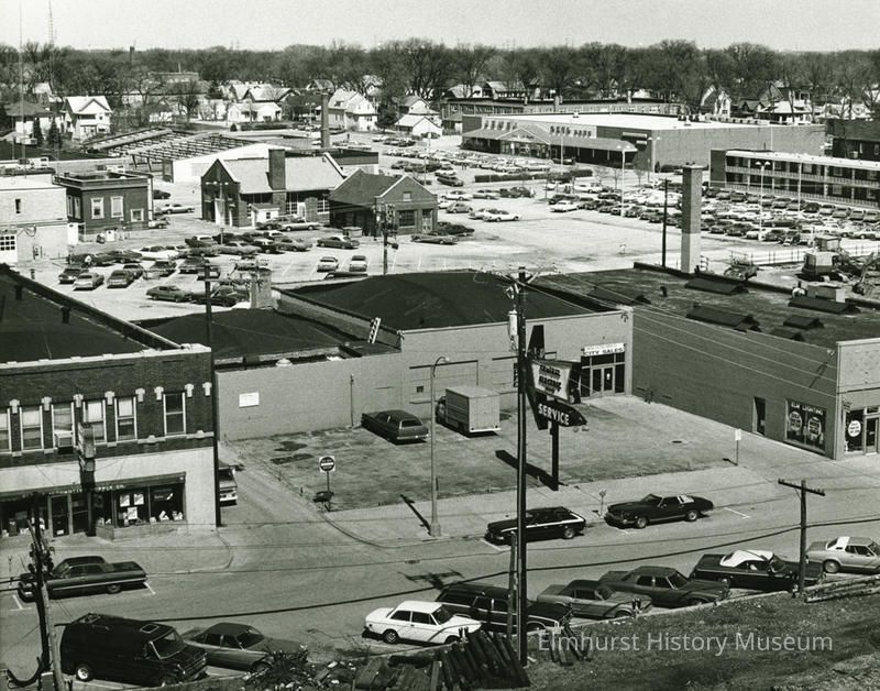An view of the area of E. First Street, N. Kenilworth Avenue and Schiller Street. The photo was taken from the Elmhurst National Bank building roof, 105 S. York St., looking northeast.Photograph Details