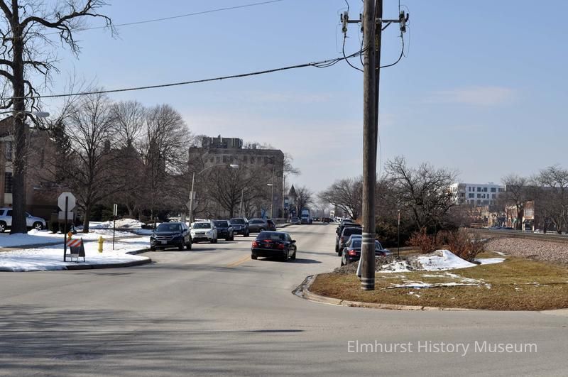 Digital photo, E. Park Avenue looking west from Haven Road railroad crossing. The 105 S. York Bank Building and the Glos Mansion are visible in the background.Photograph Details