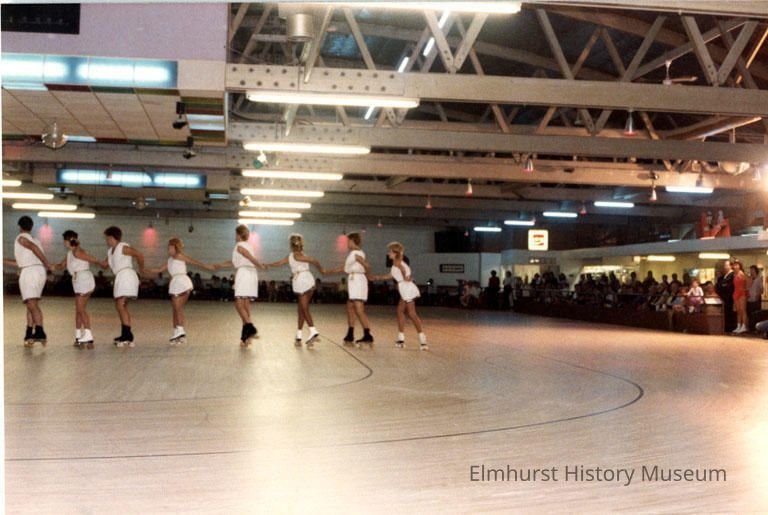 Roller skaters on the rotunda floor of the Elm Skating Club, at Butterfield and Roosevelt Road, performing a skating show.