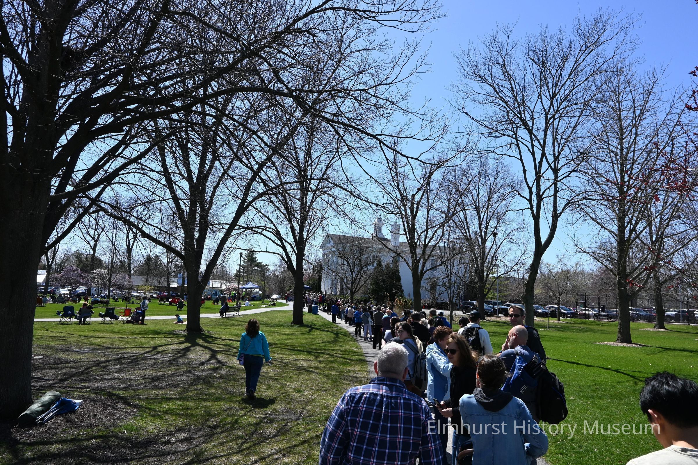 People line up to receive specialized glasses in Wilder Park to view a partial solar eclipse. The glasses were being given away by a partnership between the Elmhurst Public Library and the Elmhurst Park District.Photograph Details