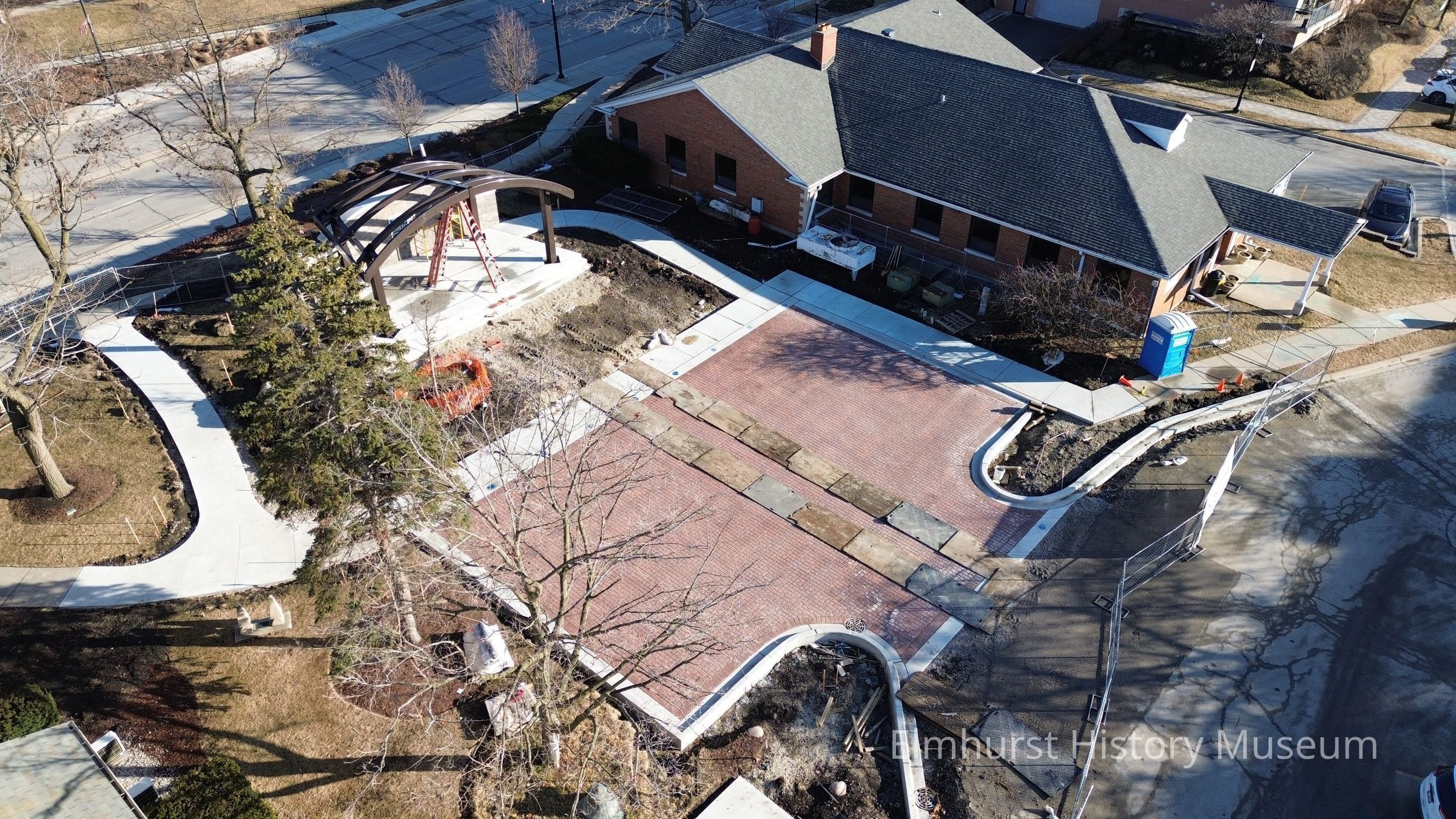 Aerial view of the performance space construction between the Elmhurst History Museum and the EHM Education Center.Photograph Details
