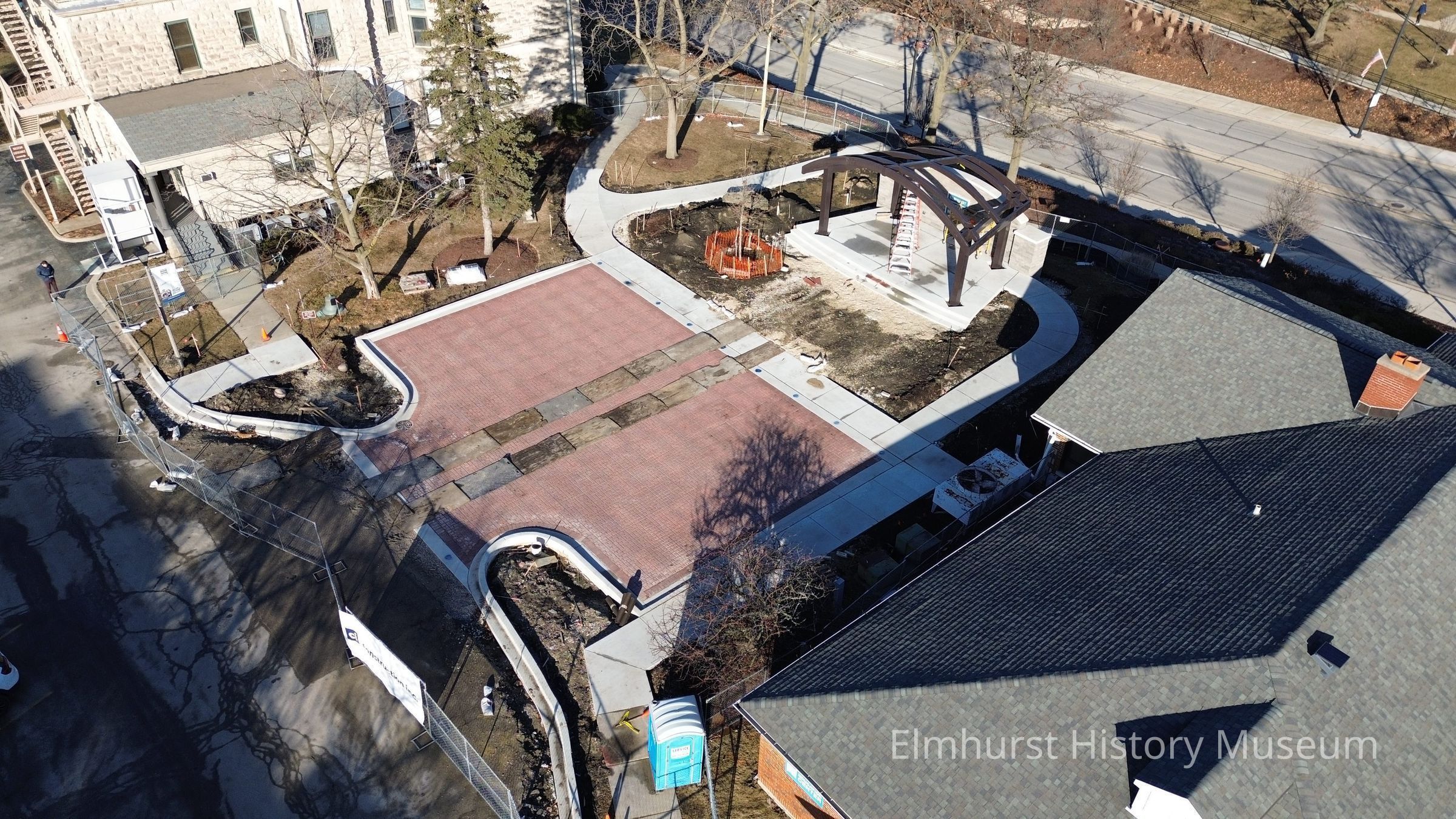 Aerial view of the performance space construction between the Elmhurst History Museum and the EHM Education Center.Photograph Details