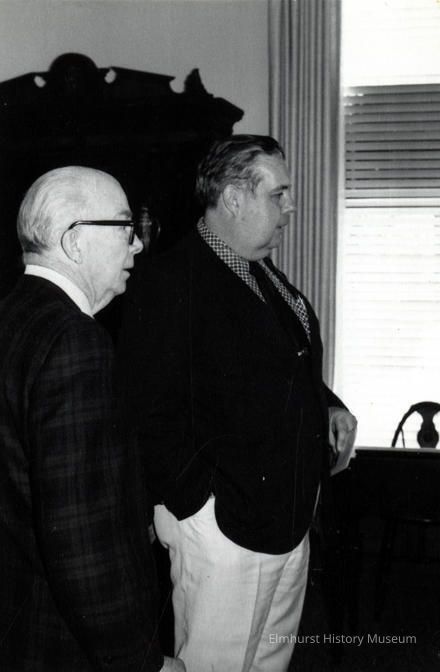 Elmhurst Historical Commissioner Brad Hilliard (left) and guest at EHM's pre-opening tour following the museum's move from the Elmhurst Public Library building to the Glos Mansion.Photograph Details