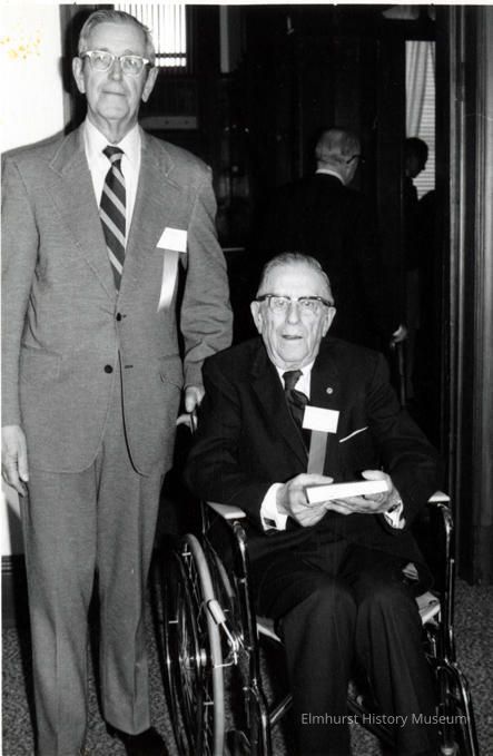 Dr. Robert Stanger (left), founder of Elmhurst Historical Society, and Fred Evers, an honorary member of Elmhurst Historical Commission, at the pre-opening tour of Elmhurst Historical Museum following its move to the Glos MansionPhotograph Details
