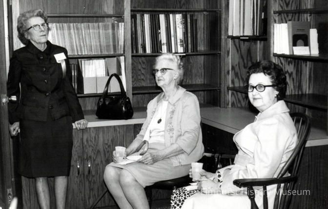 Elmhurst Historical Museum's pre-opening tour with Elmhurst Historical Commissioner Ruth Strand (l), with Mrs. Fred Evers and guest.Photograph Details