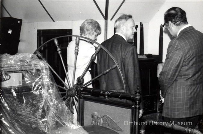 Elmhurst Historical Commissioner Warren Larson, center, showing guests the Museum's storage area two weeks before the official dedication of EHM in the Glos Mansion.Photograph Details
