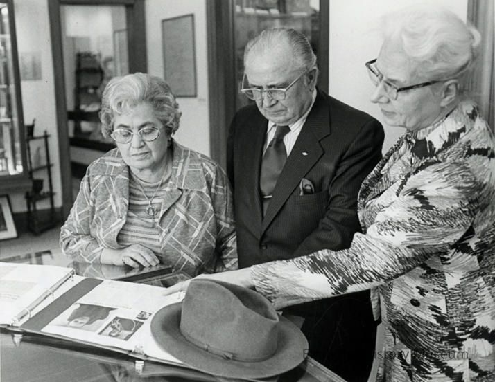 Carl Sandburg birthplace curators looking at Carl Sandburg mementos with Ruth Stickle, right, of Elmhurst Historical SocietyPhotograph Details
