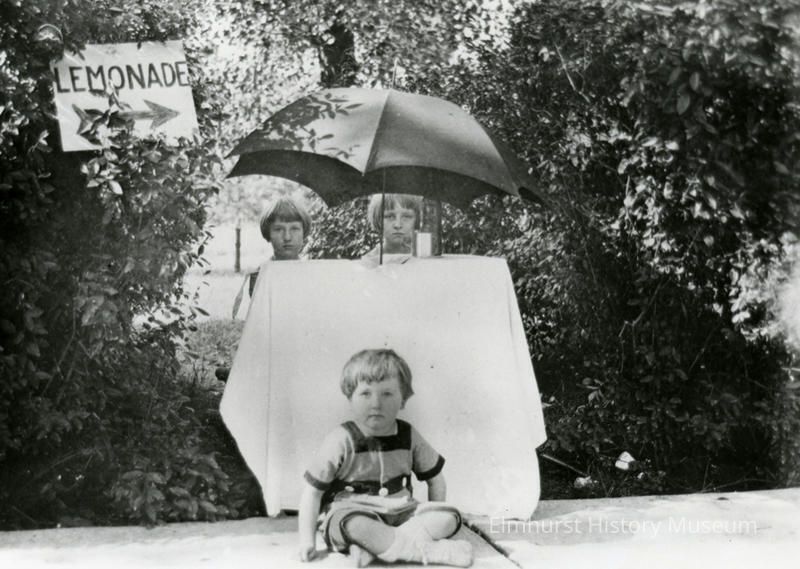 Children's lemonade stand, Eleanor Hall on the left, Ruth Hall on the right and Hall cousin Betty Cassidy in the center front.Photograph Details