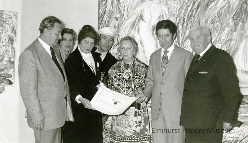 Eleanor King Hookham at a Grand Prix Humanitaire De France award ceremony at the Galerie Marcel Bernheim in 1975.Photograph Details