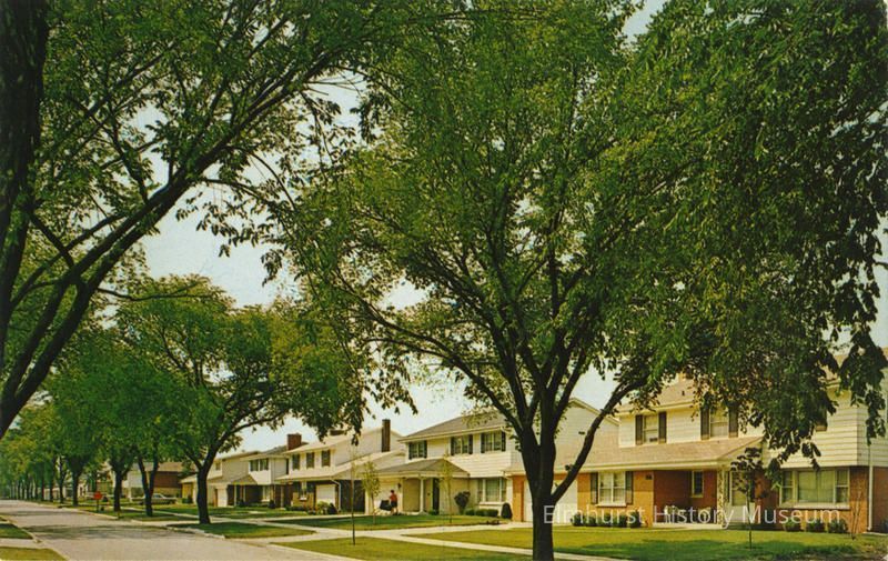 Credit printing reads "#16265 Guy Carrol Photography - Color - Art, Elmhurst, Illinois." In the top right corner is a box with words "Place stamp here." On reverse is an identification "ELM ESTATES" with several lines describing the subdivision.
