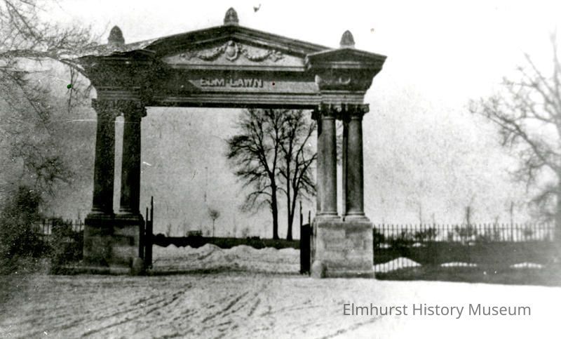Early scene of the entrance to Elm Lawn Cemetery on E. Lake Street.