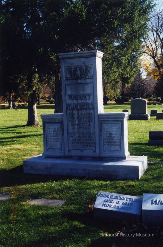 Elm Lawn Cemetery, 401 E. Lake Street, Harry Magers' monument. Magers, an Elmhurst policeman, was killed in the line of duty in 1920.Photograph Details