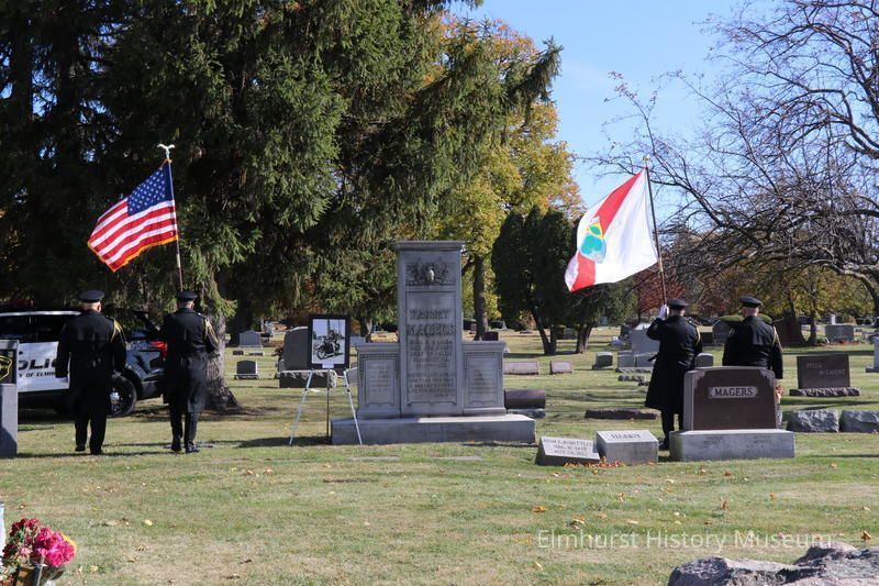 Gravesite of Harry Magers at Elm Lawn Cemetery during a 100th anniversary memorial ceremony conducted by the Elmhurst Police DepartmentPhotograph Details