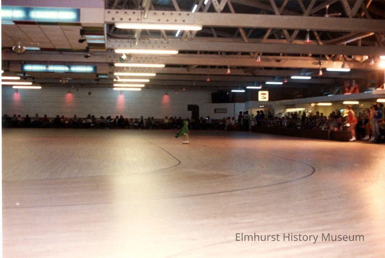 A costumed skater on the rotunda floor of the Elm Skating Club, at Butterfield and Roosevelt Road, performing a skating show.