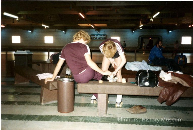 Skaters put on their roller skates on the side bench at the Elm Skating Club, at Butterfield and Roosevelt Road.