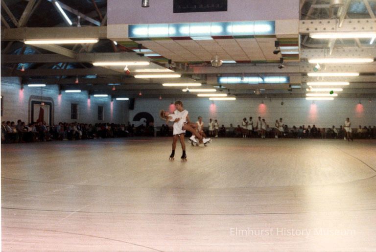 Roller skaters on the rotunda floor of the Elm Skating Club, at Butterfield and Roosevelt Road, performing a skating show.