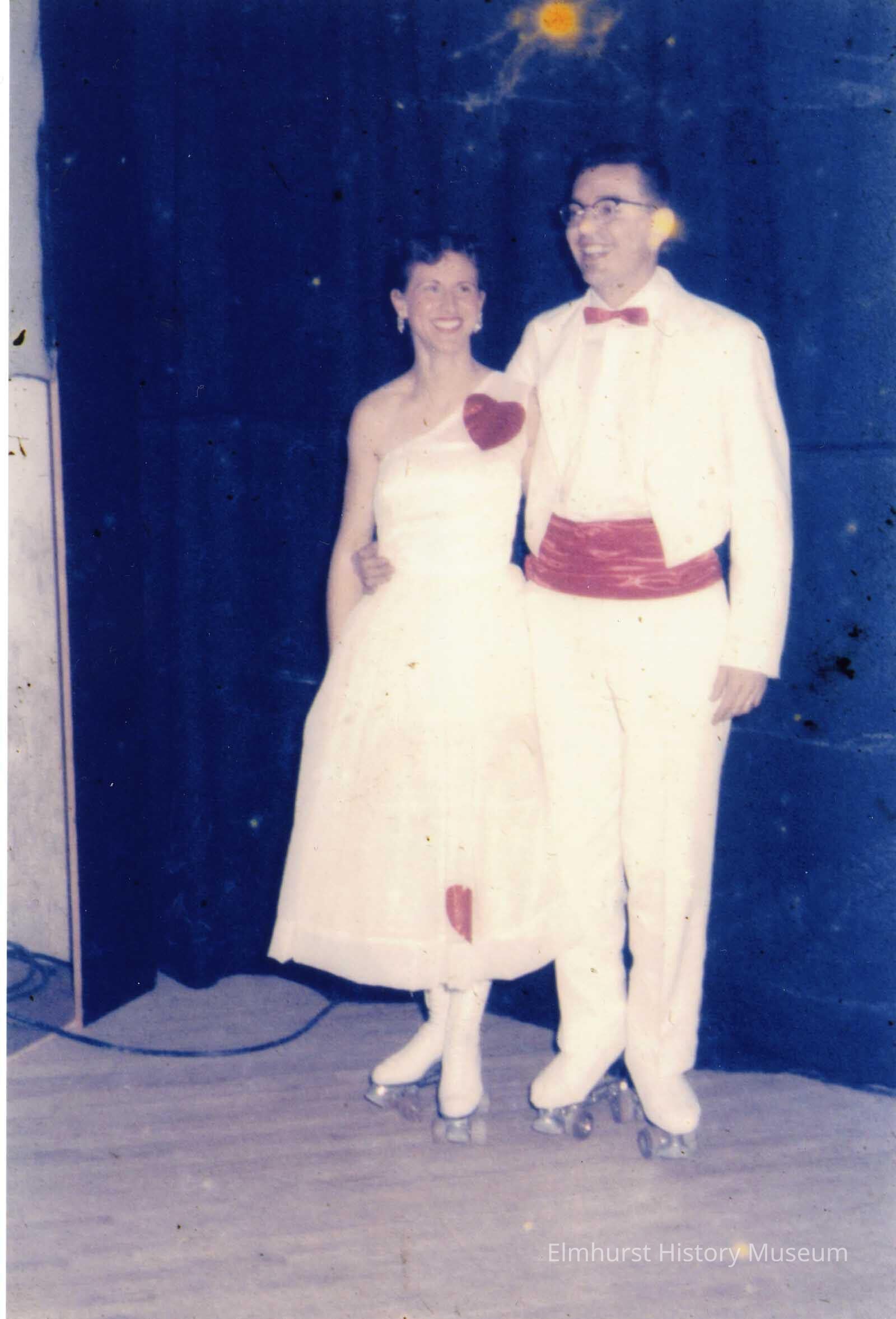 Roller skaters Ann and Bob Rowan in the Elm Skating Club "Holiday Revue" Skate Show, wearing Valentine's Day costumes.Photograph Details
