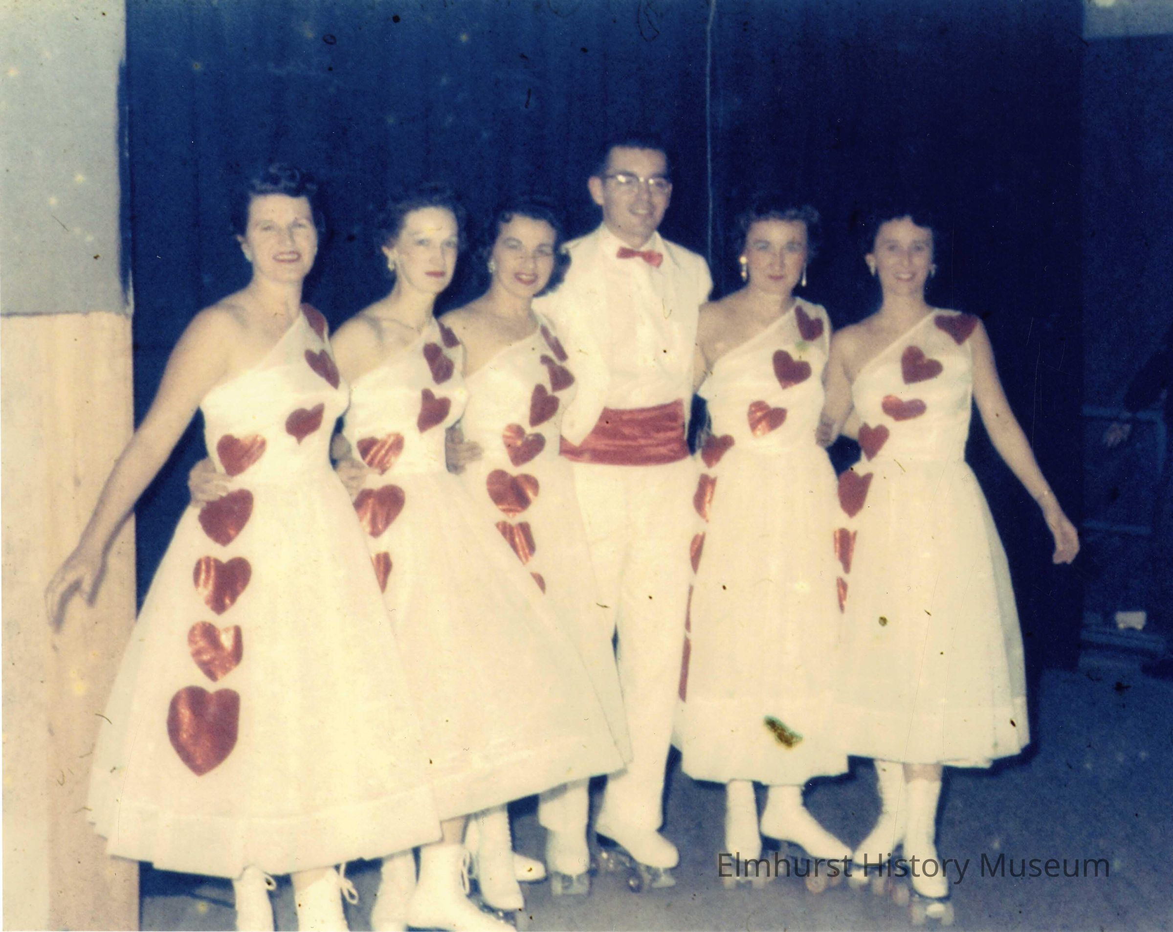 Rowan family roller skaters in the Elm Skating Club "Holiday Revue" Skate Show, wearing Valentine's Day costumes.Photograph Details