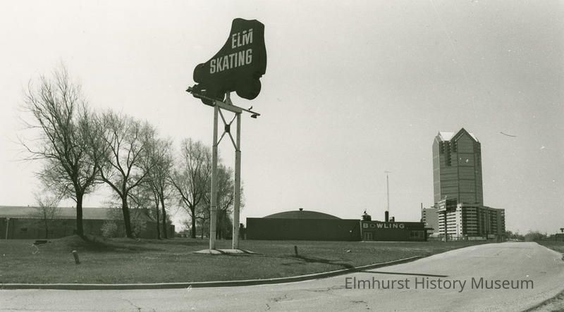 An elevated sign for "ELM SKATING," shortly before the rink's demolition in the summer of 1989. Elm Roller Skating was located at 357 W. Roosevelt Road. Elmhurst Bowling is in the background.Photograph Details