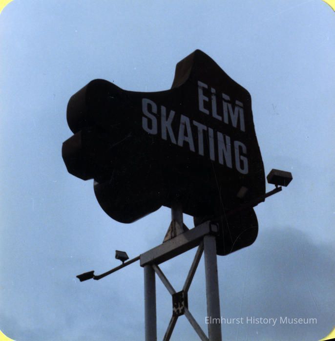 View of the large sign that stood outside of the Elm Skating Rink at 357 W. Roosevelt Road.