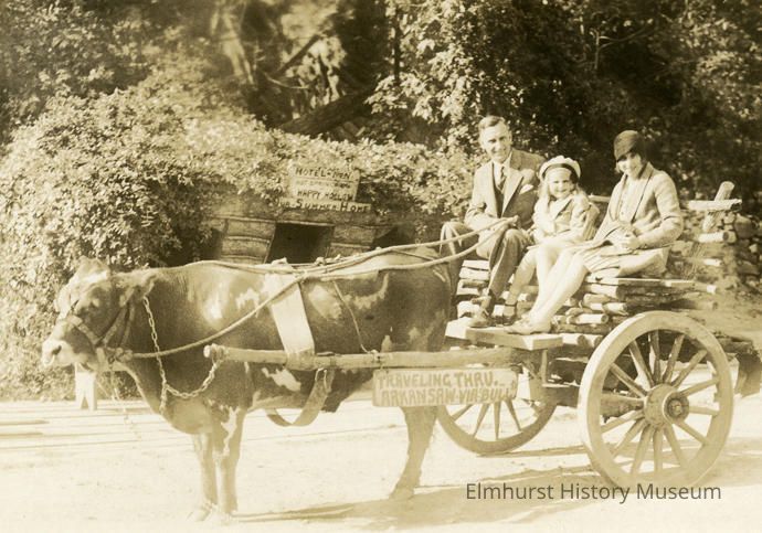 Elmer and Marylouise Engel with daughter Mary Louise sitting on a wagon hitched to a bull.Photograph Details