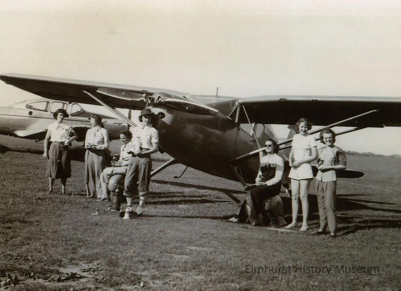 Ninety-Nines (an organization of female pilots)Air Meet entrants in front of a plane holding trophies at Elmhurst Airport