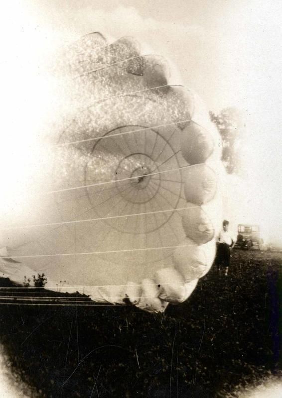 A man poses next to an open parachute at Elmhurst Airport on Lake StreetPhotograph Details