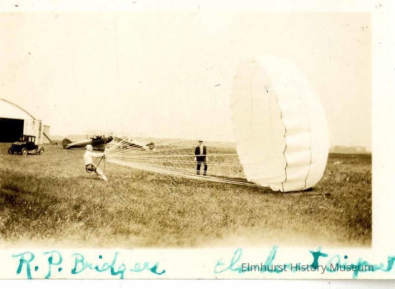 R.P. Bridgers holds an open parachute at Elmhurst Airport on Lake StreetPhotograph Details