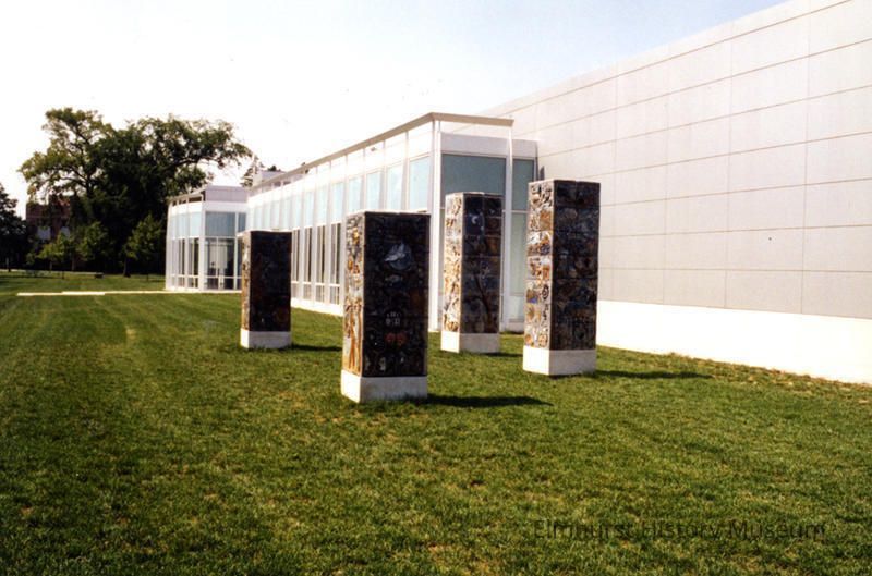South façade of the Elmhurst Art Museum at 150 Cottage Hill Avenue. Four mosaic pillars with white bases are in the foreground.Photograph Details