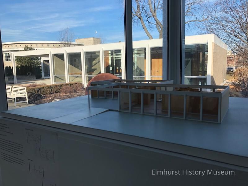 Model of Mies van der Rohe's McCormick House at the Elmhurst Art Museum, 150 Cottage Hill Avenue. The McCormick House can be seen in the background.Photograph Details