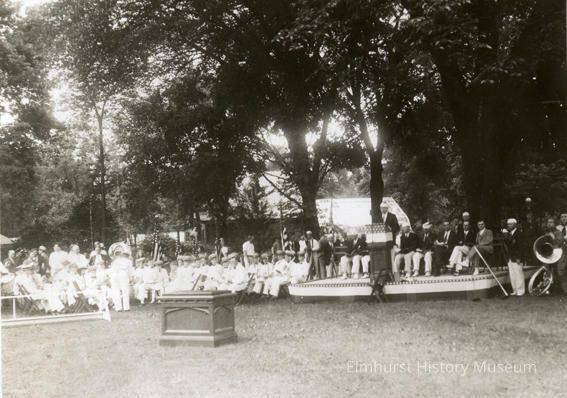 Immanuel Lutheran School band, seated people and man standing at podium, participants in Elmhurst Centennial ceremony in Wilder Park.Photograph Details