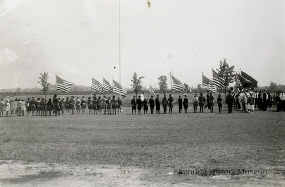 People lined up in a field, some with American flags, participants or spectators at the Elmhurst Centennial ceremony.Photograph Details