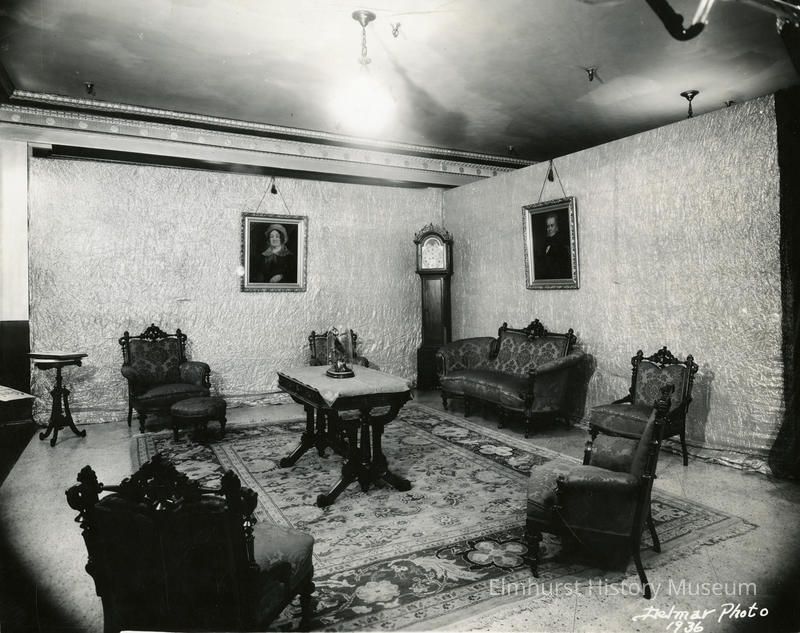 Written on back of image: Could be special display (temporary room display) for Elmhurst Centennial Stamped on back: Delmar Studios / 125 So. York St., PH 574 / Elmhurst, ILL Written on front lower right corner: Delmar Photo