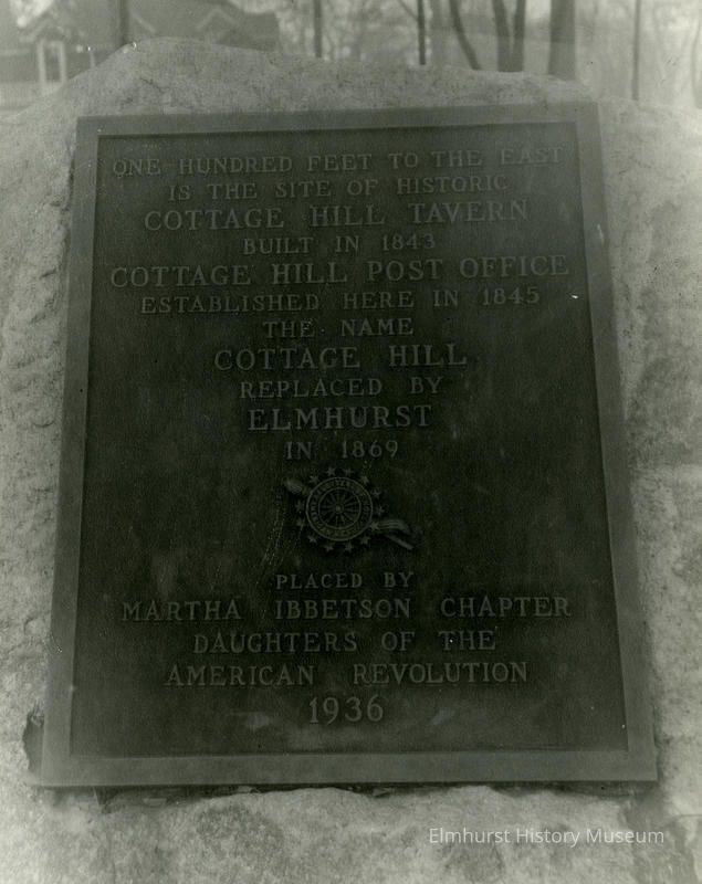 Written on back of image: Historical marker / Erected 1936 / Cottage Hill Ave & St. Charles Rd. / Elmhurst, Ill / November 1946 / Em Zetterbund