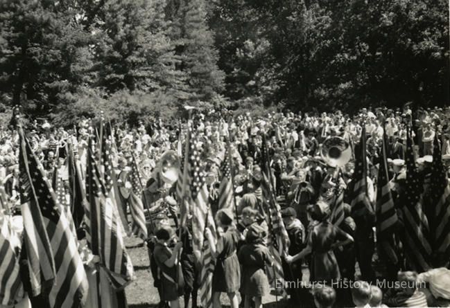 Scout troops with flags and people in a park at the Elmhurst Centennial pageant.Photograph Details