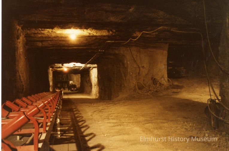 on back: mine conveyor leading to crusher area, drift passage to the right. February 1983