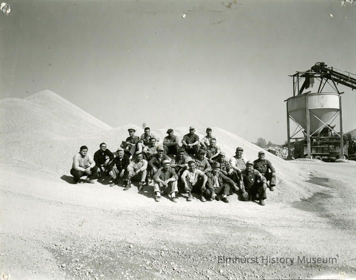 Company staff sit on a pile of gravel at the Elmhurst-Chicago Stone Quarry, 400 W. First Street