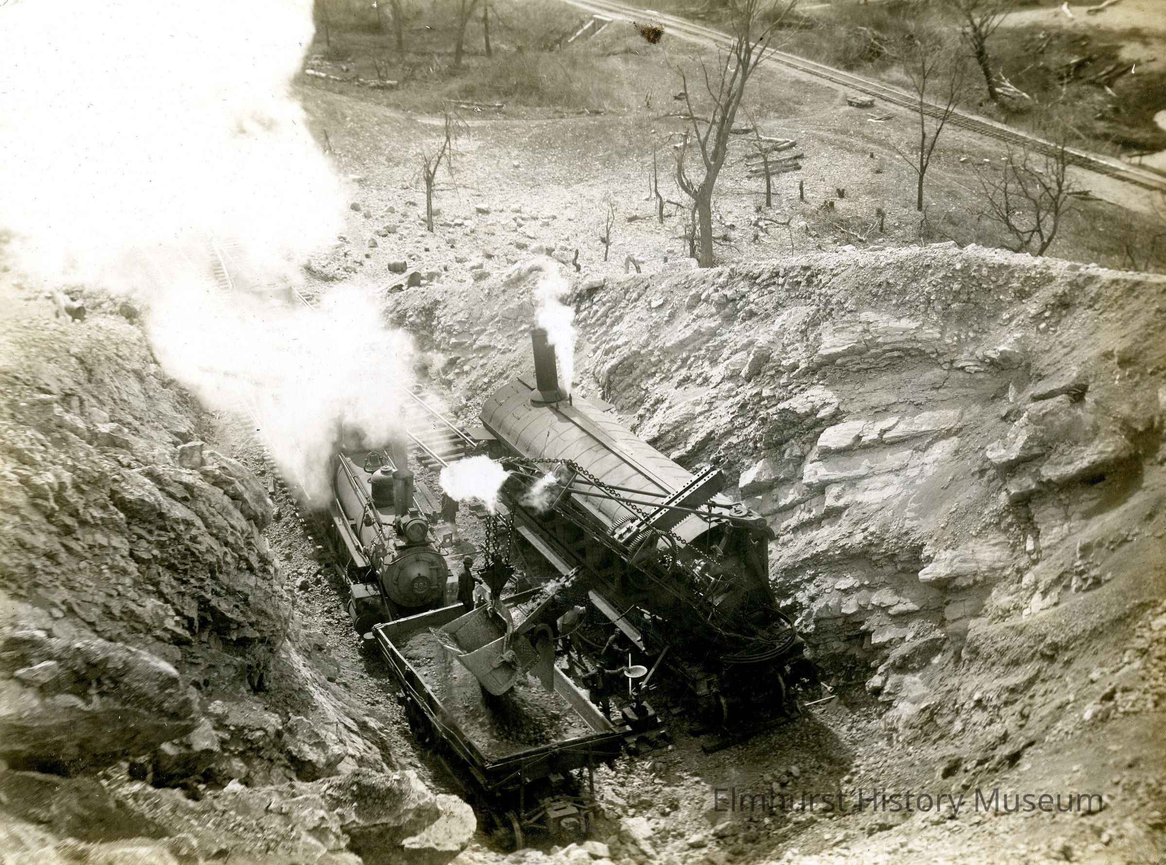 A rail-based steam shovel in action at the Elmhurst Chicago Stone Company Quarry.