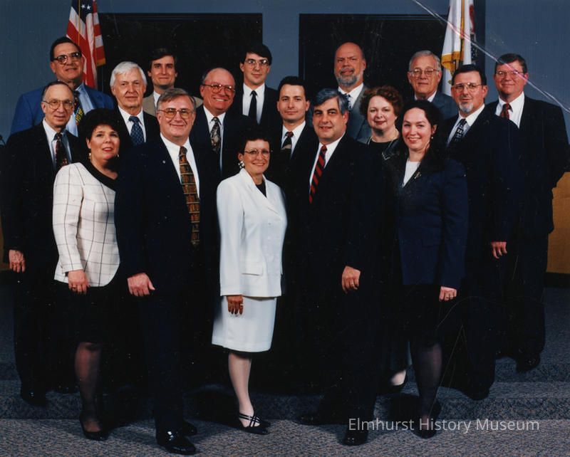 Elmhurst mayor, treasurer and city clerk and 14 city council members after swearing in ceremony. Pictured are identified as follows: First row, left to right: Carol Lenard, 4th Ward; David Dyer, Treasurer; Janet S. Edgley, City Clerk; Thomas D. Marcucci, Mayor; Susan J. Rose, 3rd Ward Second Row, left to right: Gerald Wolin, 7th Ward; John Gow, 4th Ward; Phil Jordan, 5th Ward; Dennis M. Reboletti, 2nd Ward; Janice Vanek, 2nd Ward; James J. Parker, 5th Ward. Third (back) Row, left to right: William E. Friberg, 3rd Ward; Paul Fichtner, 1st Ward; Peter W. Balgemann, 6th Ward; Donald F. Olson, 6th Ward; Norman T. Reinertsen, 1st Ward; George Szczepaniak, 7th Ward.Photograph Details
