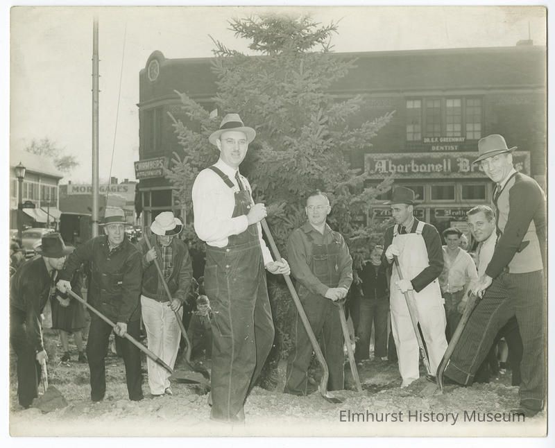 "Manning the Shovels, Beautification Project, Chicago & North Western Right of Way at York St. & Park Ave." Men are identified left to right as Hugo Brodt (alderman), Frank Maier (alderman), William Fellows (alderman, later mayor), Byron Stevens (alderman), unidentified, C. "Andy" Anderson (alderman), Howard Wilman (alderman) Claude Van Auken (mayor).Photograph Details