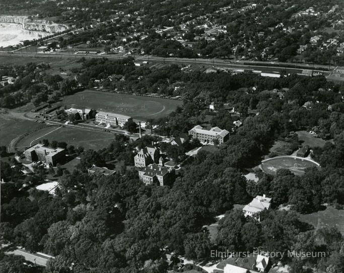 Aerial view of Elmhurst College campus. Roof of Wilder Mansion is on the right and Elmhurst-Chicago Stone Company quarry is visible in top left corner.Photograph Details
