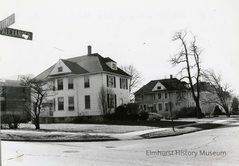 The corner of Prospect Street and Alexander Boulevard, showing 208, 216, 224, and 232 Alexander Boulevard in November 1986, later torn down for Elmhurst College computer center.