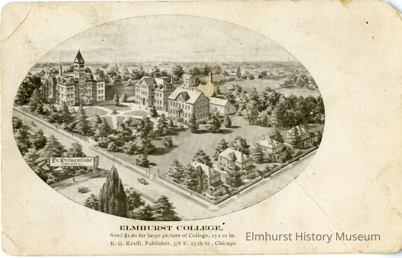 Printed in black ink on the front "Elmhurst College. Send $1.00 for larger picture of College. 15x21 in. E.O. Kraft Publisher /378 E. 25th St., Chicago. Ev. Proseminar, Elmhurst, Ill." Written in red ink on back "College started - 1871-1872.".