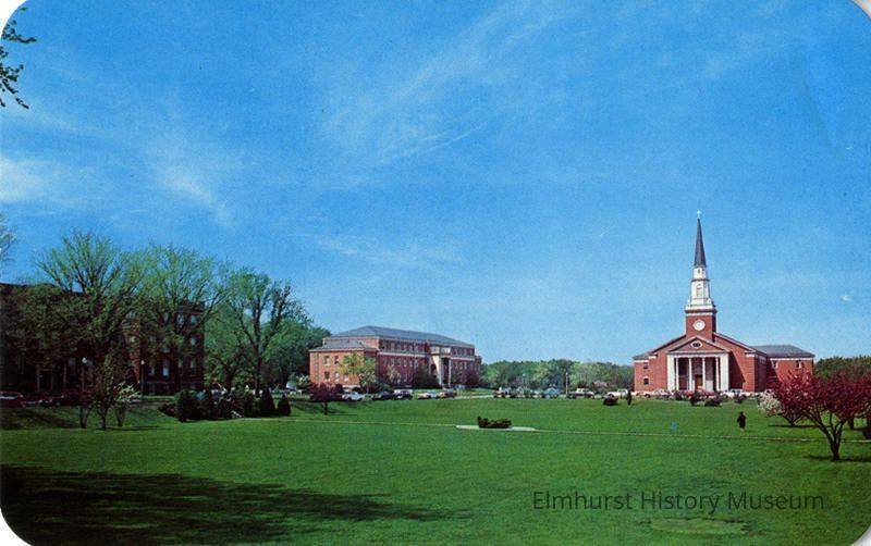 Postcard photograph of the southwest side of Elmhurst College campus with Schick and Dinkmeyer Halls and Hammerschmidt Chapel.Photograph Details