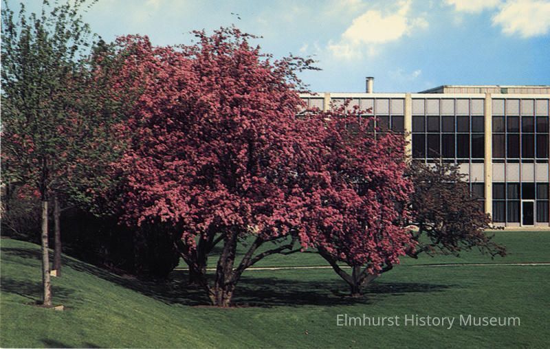 Elmhurst College Union Building and trees that are part of the arboretum campus.